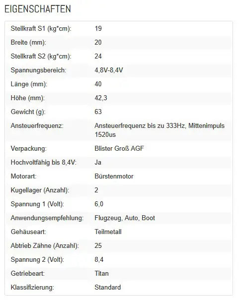 Das AGF-RC B53DHS ist ein 20mm Standard Servo mit einem Teil-Aluminiumgehäuse. Das Servo ist HV fähig und kann direkt an einem 2s LiPo betrieben werden (4,8 - 8,4V) .